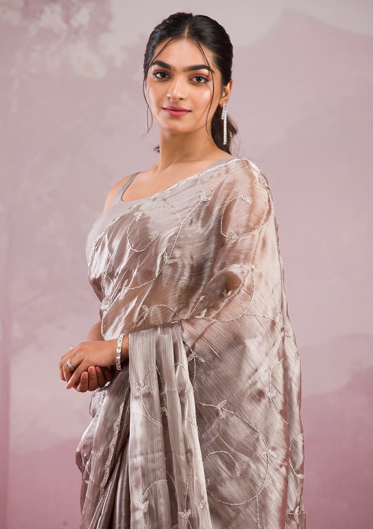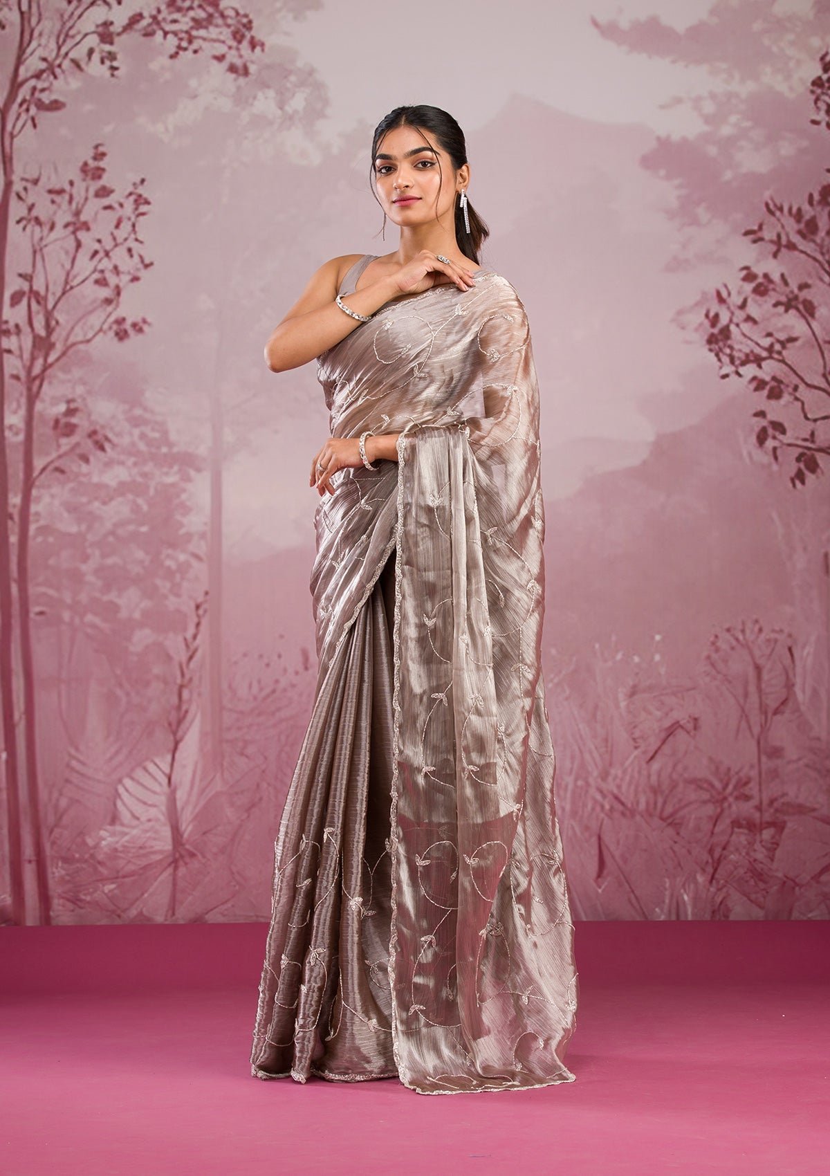 – The Saree is elevated with Cutdana embroidery