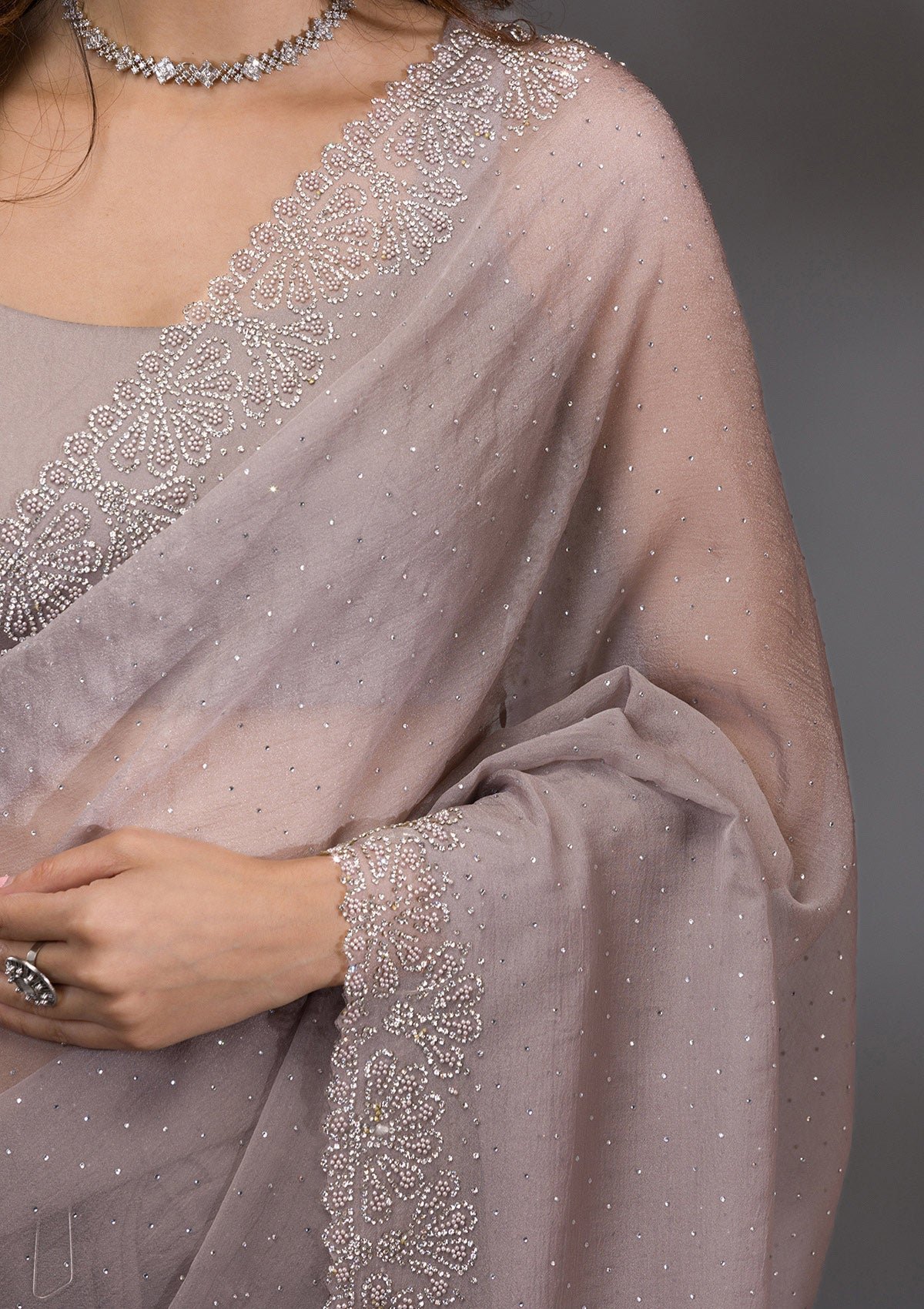 – The Saree is elevated with Silver Stonework embroidery