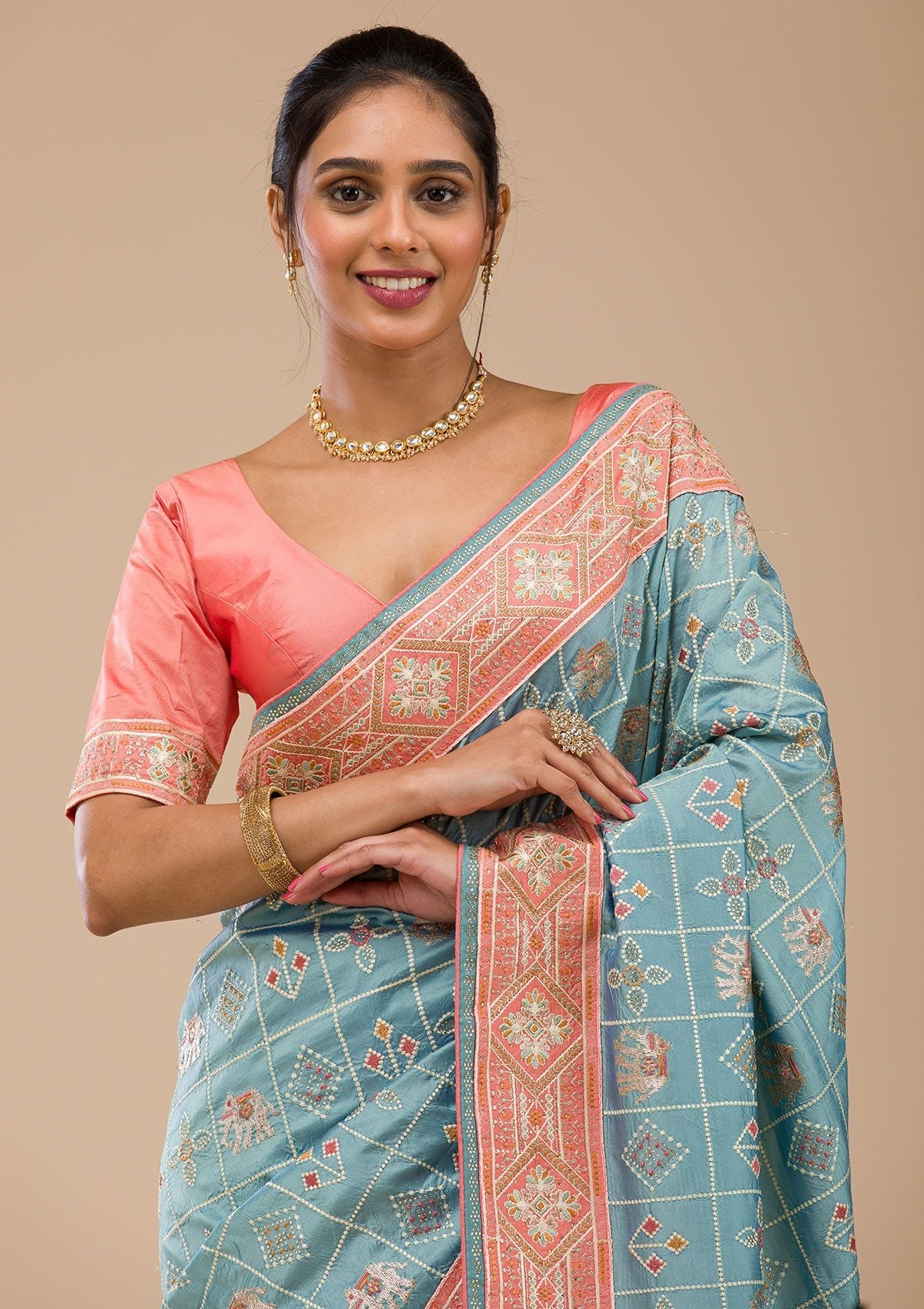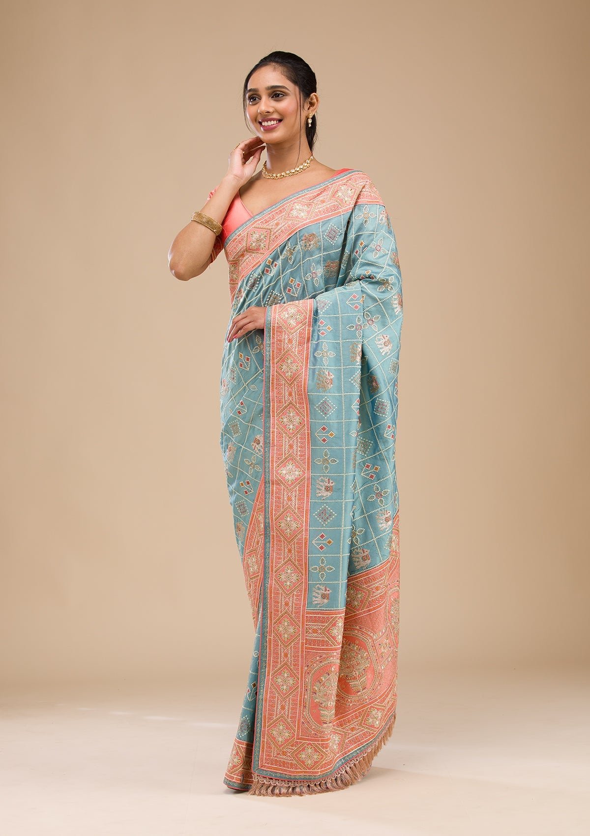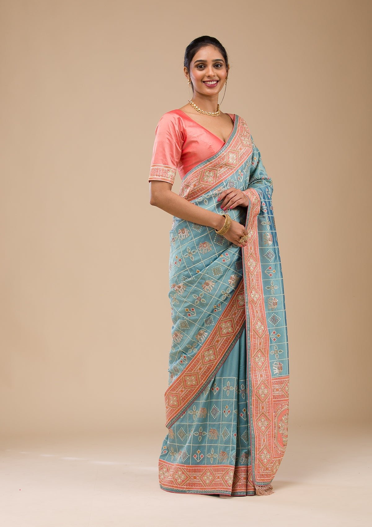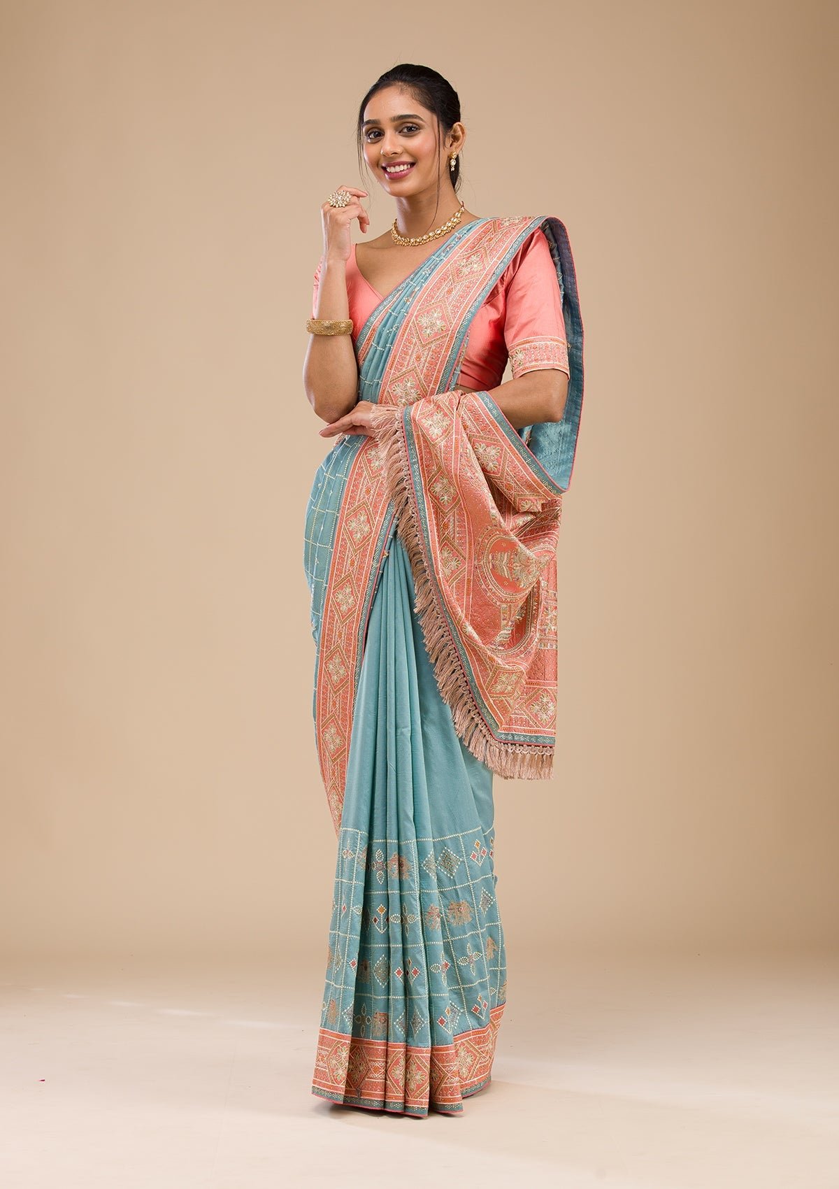 – The Saree is elevated with Threadwork embroidery